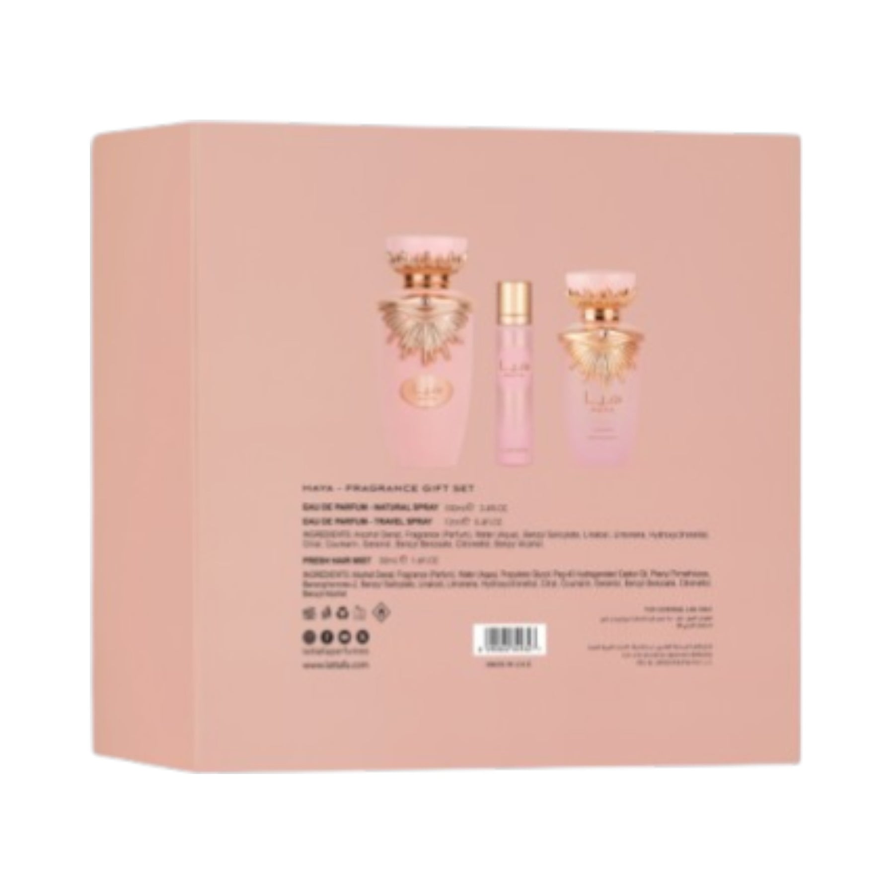 Order Haya Gift Set by Lattafa today from Freshity and enjoy a beautiful fruity floral fragrance set with perfume, travel spray, and hair mist.