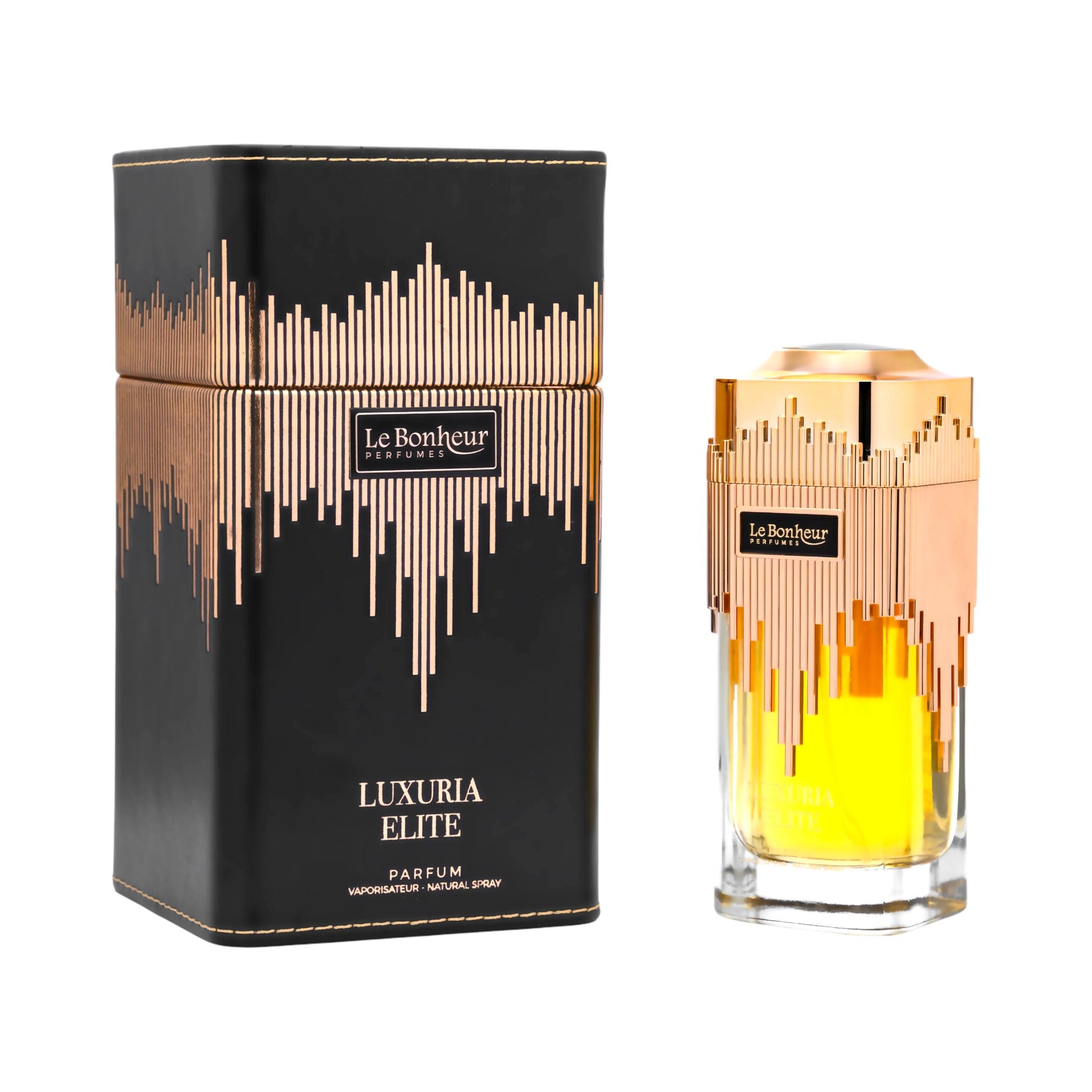 Refined and powerful — Luxuria Elite by Le Bonheur is a spicy leather fragrance combining citrus brightness with deep luxurious warmth.